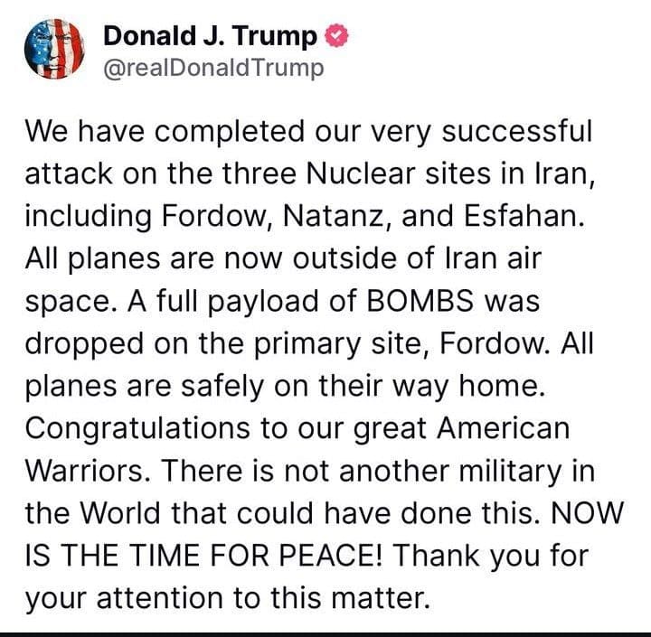 “We have completed our very successful attack on the three Nuclear sites in Iran, including Fordow, Natanz, and Esfahan. All planes are now outside of Iran air space. Congratulations to our great American Warriors. There is not another military in the World that could have done this. NOW IS THE TIME FOR PEACE!”
